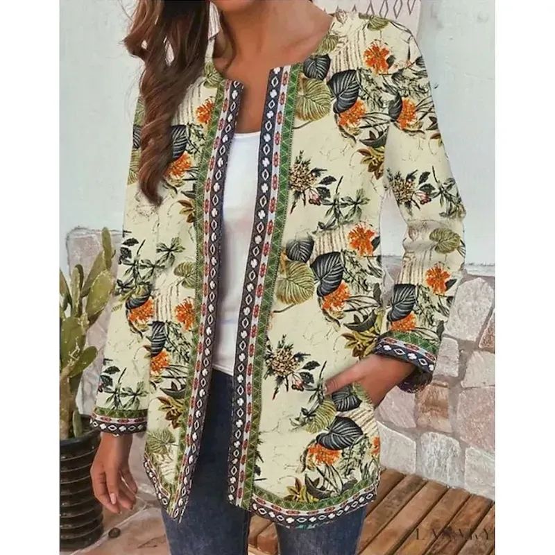 Women’s Blazer Work Print Floral Comfortable Elegant Regular Fit Outerwear Long Sleeve Fall Yellow S