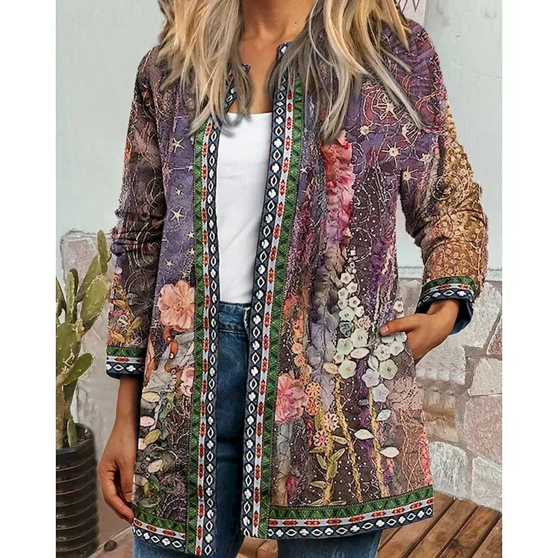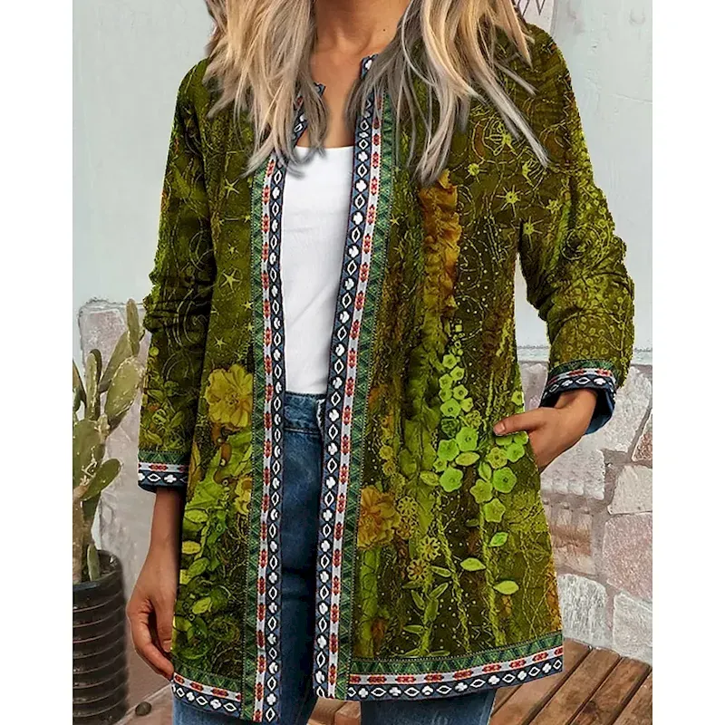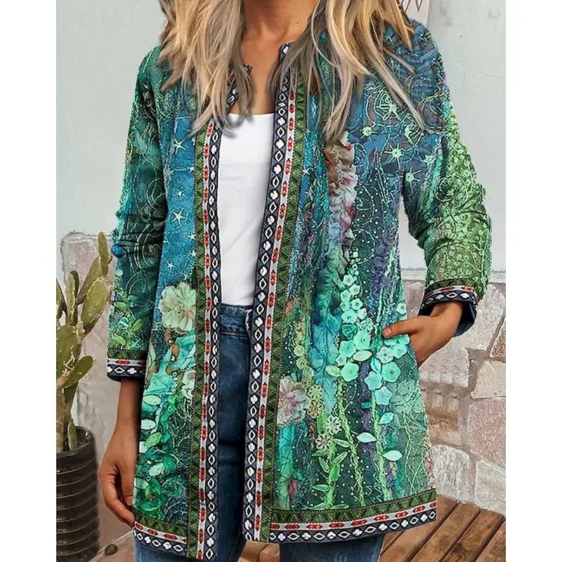 Women’s Dressy Dusters Dressy Jackets Casual Jacket Street Going out Fall Winter Regular Coat Regular Fit Warm Comfortable Fashion Modern Jacket Long Sleeve Floral Pocket Light Green Purple Green