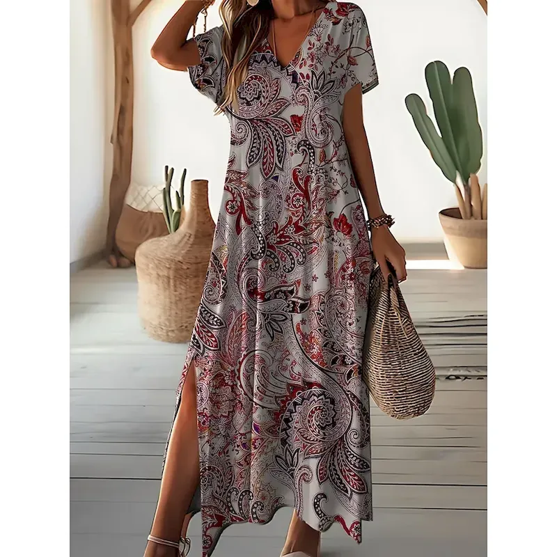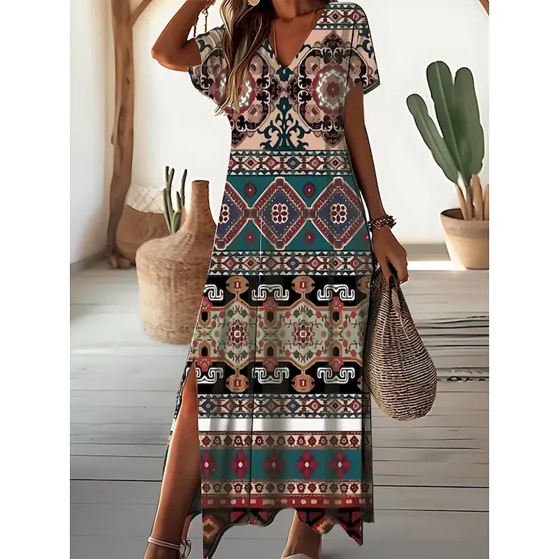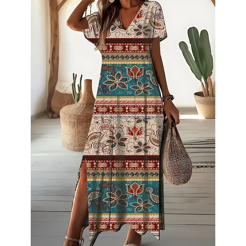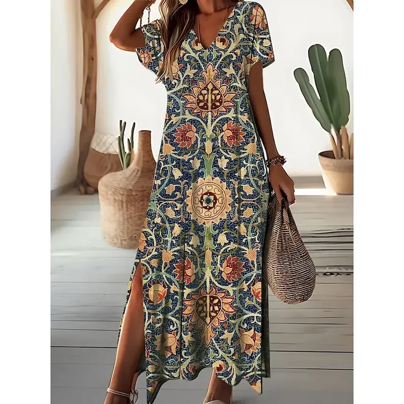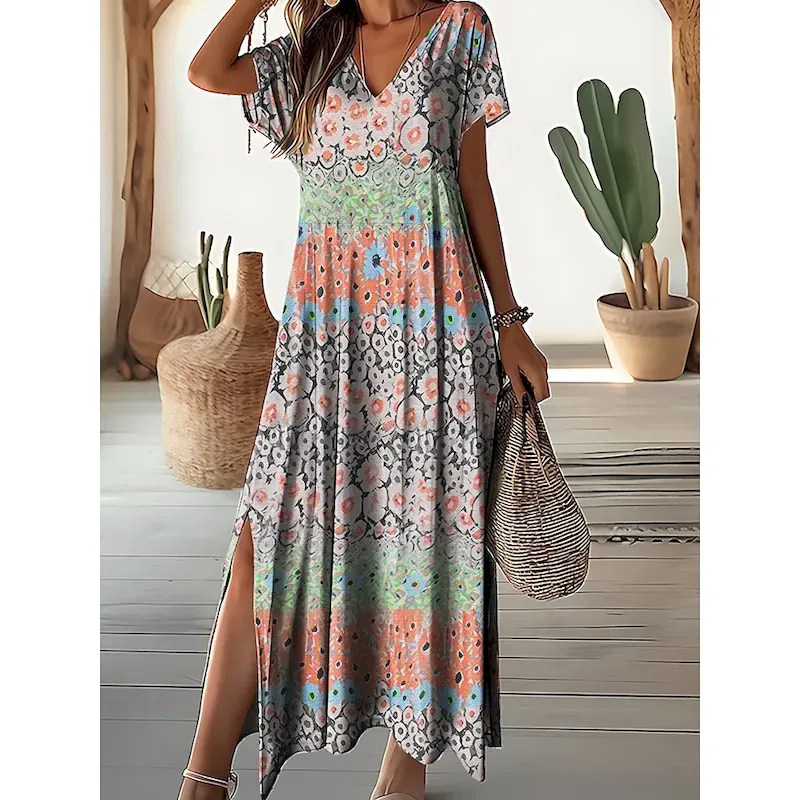 [Fabric] Crafted from a lightweight and breathable polyester blend, this maxi dress offers a comfortable and micro-elastic fit perfect for warmer weather. The additional inclusion of cotton spandex jersey ensures a soft feel against the skin, providing ease for all-day wear. [Silhouette] The dress boasts a regular fit with a graceful maxi length and flowy silhouette, creating a flattering and elegant look for various body types. The short sleeves and relaxed style make it ideal for daily wear.[Design Highlights] Featuring a vibrant floral and ditsy floral print, this dress beautifully combines bohemian and modern styles. The elegant V-neckline and side slits add an element of sophistication and ease of movement, while the colorful geometric patterns evoke a lively, energetic spirit.[Occasions] This versatile dress is perfect for vacations, beach outings, and casual daily activities or weekend getaways. Its stylish and comfortable design makes it suitable for both relaxed atmospheres and more social occasions, providing a chic and fashionable appearance.[Size Information] Available in a wide range of sizes including S, M, L, XL, and XXL, this dress ensures an accommodating fit for many. Whether you’re enjoying a day out or a casual gathering, the dress adapts to various settings seamlessly.OK