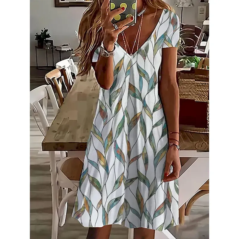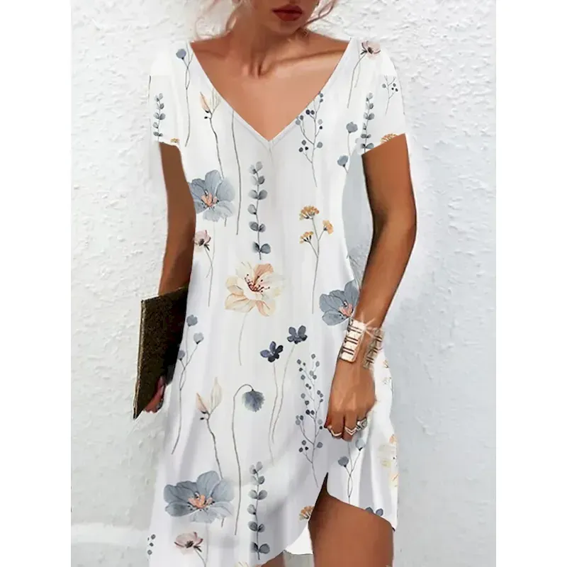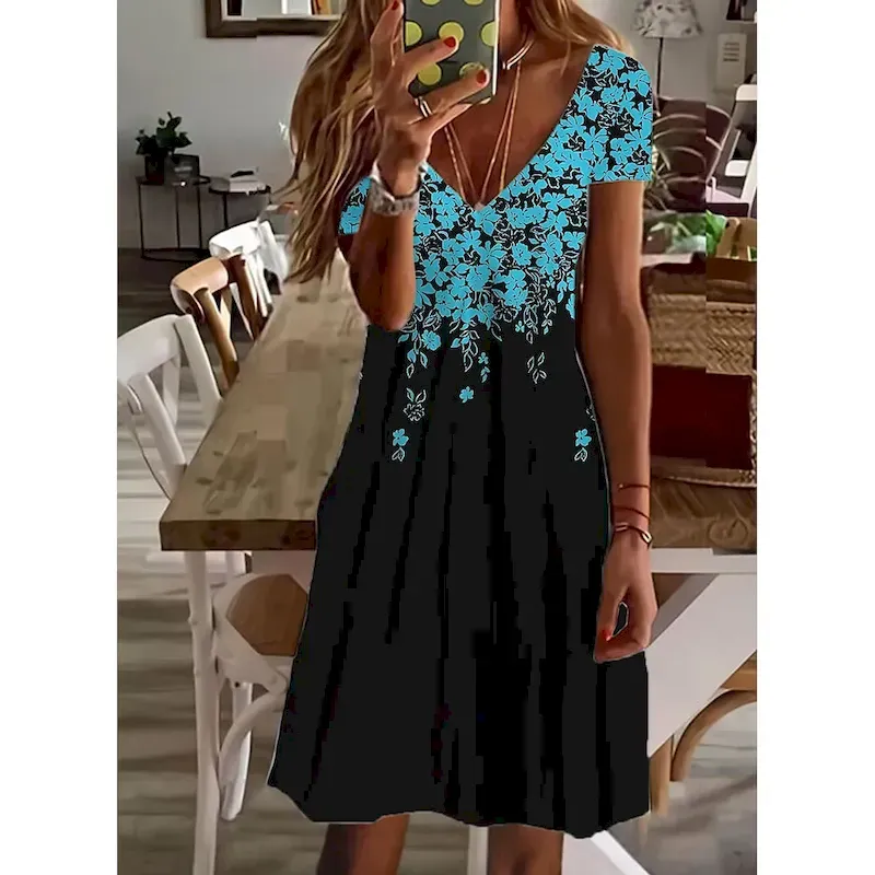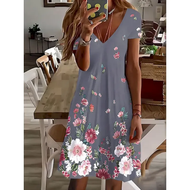 [Design Highlights:] This mini dress stands out with its vibrant floral print, combining colorful pink, white, and green hues on a soft pastel blue backdrop. The V-neckline elegantly frames the neckline, while the short sleeves provide a casual yet chic look. Its playful print and flowing design make it a perfect match for modern fashion trends.