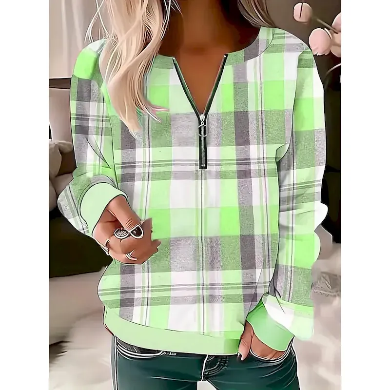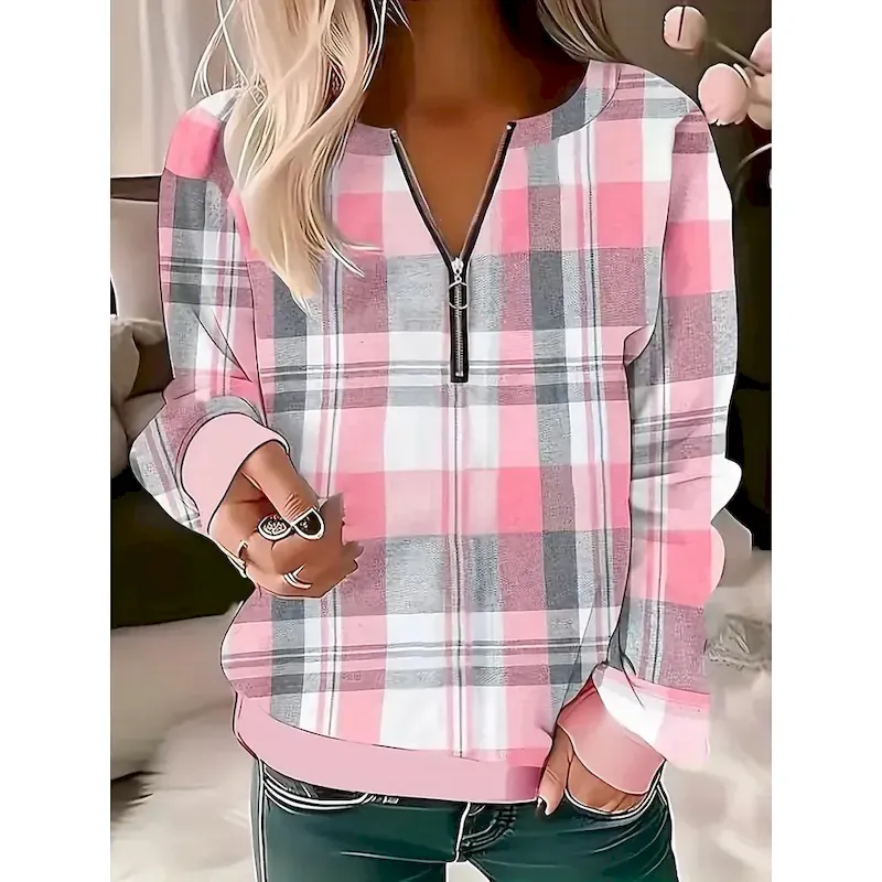 Women’s Pullover Sweatshirt Zip Up Sweatshirts Graphic Geometric Plaid Fashion Casual Long Sleeve Crew Neck Regular Tops Street Dailywear Zipper Print Pink Blue Purple Green Gray Fall Winter