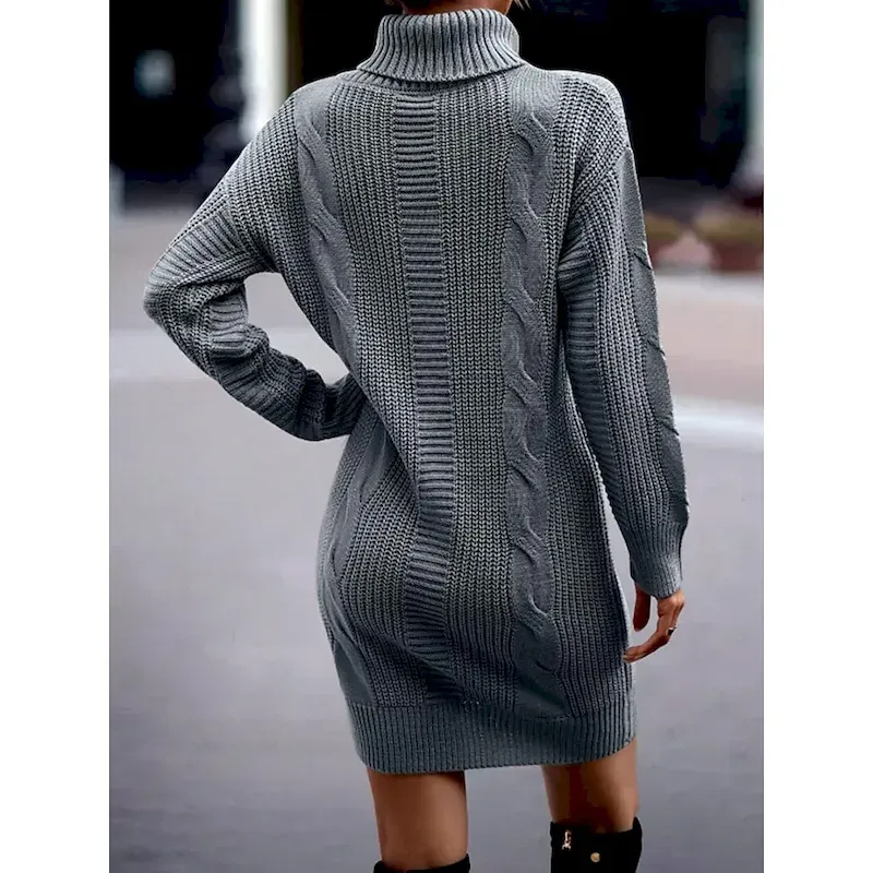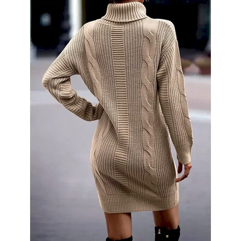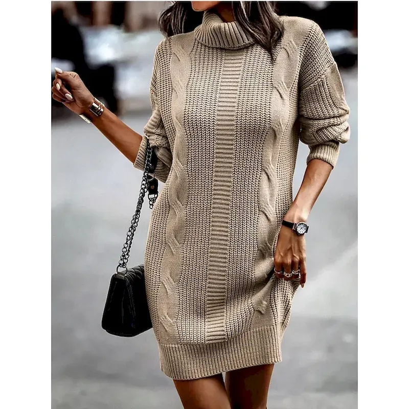 [Fabric] Crafted from soft acrylic, this sweater dress offers a perfect blend of warmth and comfort. The high-quality knit material ensures a flexible yet cozy feel, making it ideal for fall and winter wear.[Fit] The dress is designed with a regular fit that flatters various body types while maintaining an elegant silhouette. Its long-line style provides both comfort and sophistication, perfect for creating a stylish yet relaxed look.[Design Highlights] Featuring a classic turtleneck, the dress adds a touch of timeless elegance. The intricate cable knit pattern and long sleeves with ribbed cuffs enhance its chic and trendy appeal. Available in pure colors like Pink, Gray, and Khaki, the dress is both versatile and fashionable.[Occasions] Ideal for daily wear, outdoor activities, and weekend outings, this sweater dress effortlessly combines style and practicality. Whether you’re heading to a casual gathering or a more dressed-up event, it offers a perfect choice for various occasions.[Sizes] Available in sizes S, M, L, XL, and 2XL, this dress caters to a wide range of body types, ensuring a comfortable and flattering fit for everyone.OK