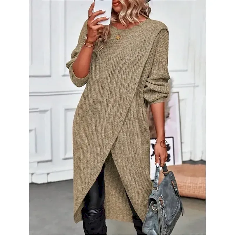 [Design Highlights]: The sweater features a classic crew neck and a sophisticated wrap design with an asymmetrical hemline, adding a modern and chic touch to your wardrobe. The neutral pure color palette, including green, gray, and khaki, allows versatile pairing with various outfits.